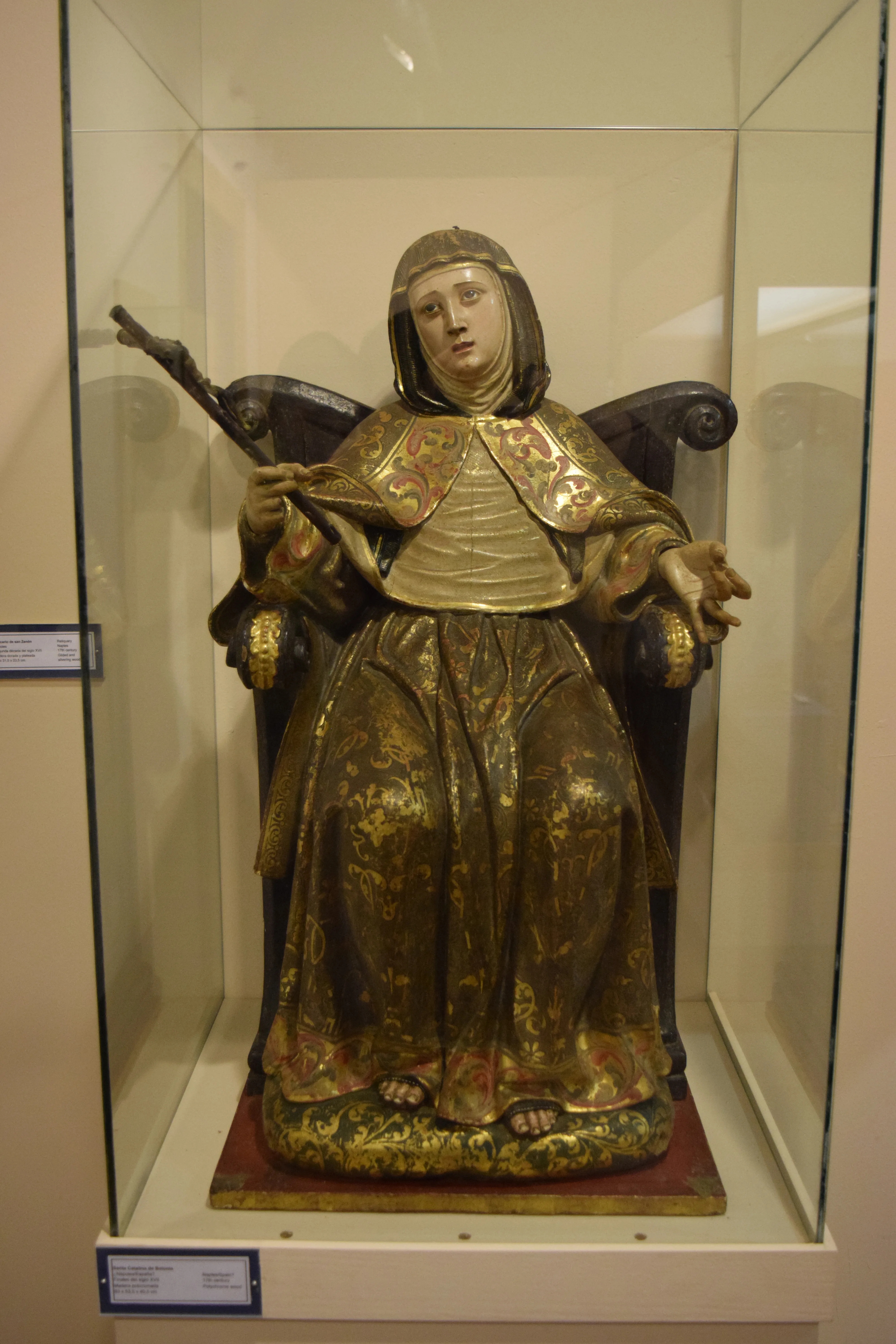 Esta escultura sedente representa a Santa Catalina de Bolonia de corpo enteiro, sentada sobre un sillón de madeira rematado en volutas nos seus extremos. Na súa man dereita sostén un crucifixo, mentres que na esquerda parece suxeitar un obxecto hoxe desaparecido, probablemente un rosario.